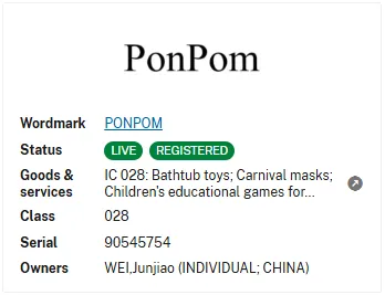 PonPom美国商标注册在28类浴缸玩具、狂欢节面具、毛绒玩具、桌面游戏、玩具动物及其配件等,商标号6627087: