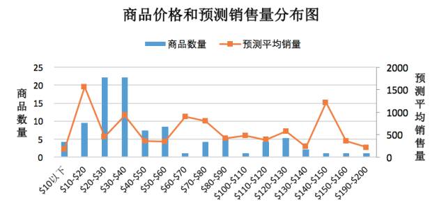 在本期Straighteners品类Best Sellers榜单前一百的商品中,商品最高价$199.00,最低价$1.86,平均价格$53.43。该品类商品价格跨度较大,在$20-$30和$30-$40的商品最多,都有22款商品,$10-$20有着最高的预测平均销量,尚存市场空间。