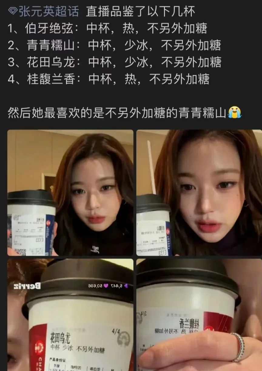比如,1月24号韩国女星张元英来广州开签售会,她当晚在自己的直播间中就点了四杯霸王茶姬,