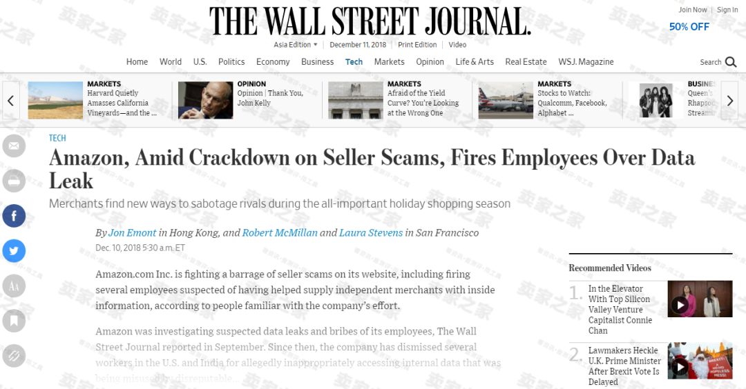卖家之家获悉,据外媒“华尔街日报”12月11日最新报道,有知情人士透露,亚马逊公司正在其网站上打击一连串卖家诈骗案,其中包括解雇几名涉嫌泄露数据提供给第三方卖家的员工,这些被泄露的数据可以用来促进销售。