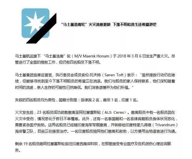 马士基航运也已连发两份火情进展说明,客户将陆续收到不幸的通知!