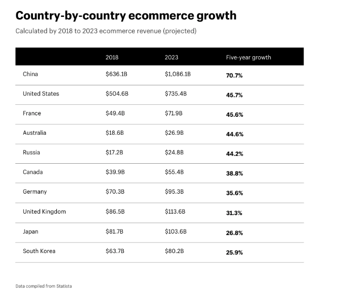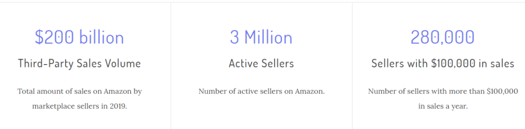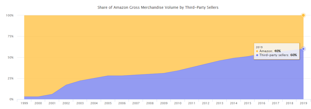 全世界的线上零售额将会持续增长,预计2020年突破3万亿美元大关,达到3.535万亿美元。数据显示零售额占整体零售额比例连年上升,整体趋势良好,预计2020年线上零售额占比达到16.1%。(eMarketer,2019)。预计,大多数国家的电商销售额都呈现上升的趋势,电商潜力巨大(statista,2019)。而在Market Pluse公布的数据则显示,亚马逊的网站的成交金额(GMV)一骑绝尘,从1999年的17亿美元增长到2018年的2770亿美元。而亚马逊第三方卖家的销售额从1999年的1亿美元增长到了2019年的1600亿美元。2019年,第三方卖家贡献了60%的销售额,而第三方卖家的贡献度趋势还在上升! *GMV=销售额+取消订单金额+拒收订单金额+退货订单金额。