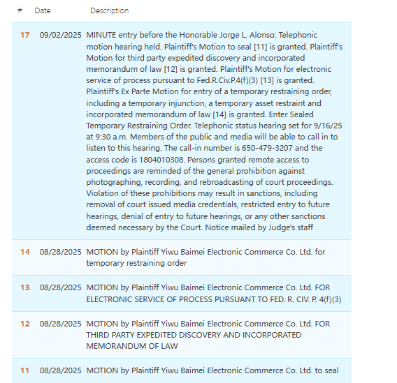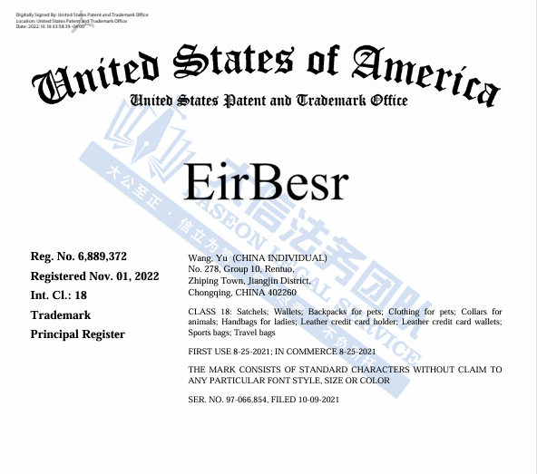 此案为商标维权,原告在8月份发起了3次诉讼,目前25-cv-09003已经撤诉,其余两个案件还在受理中,涉及商标词为:EirBes,于2022年11月1日注册,主要涉及第18类(钱包、包类、宠物服饰/背包/项圈),以下是涉及商标具体信息,未经授权不得擅自使用,侵权风险极高,跨境卖家尽快检索下架,避免TRO侵权风险!