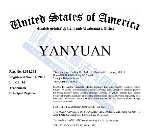 此案为商标维权,针对商标词为YANYUAN,该商标注册在第14大类,涵盖玛瑙、手镯、钟表、耳环、祖母绿以及珠宝等类目,以下是涉及商标具体信息,未经授权不得擅自使用,侵权风险极高,跨境卖家尽快检索下架,避免TRO侵权风险!