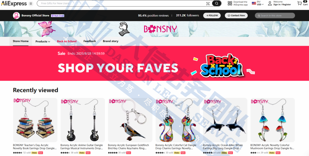 原告是来自中国义乌的商贸公司,BONSNY是其旗下品牌。公司旗下核心品牌为BONSNY,主打小饰品的设计与生产。该品牌成立于2010年,产品材质选用合金、水晶、珍珠等优质材料,设计灵感源自自然、动植物及流行文化元素,风格多样,兼具时尚感与实用性。产品线涵盖:项链、手链、耳环、戒指等时尚配饰;发饰、胸针等工艺品。
