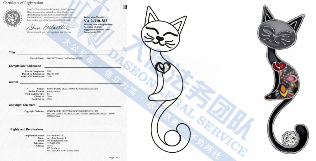 除此之外,原告还注册“长尾猫图像”,注册号 VA 2-330-282,作品含两张长尾猫照片,猫心脏处贴有涉案商标设计,以下是涉及商标版权的具体信息,未经授权不得擅自使用,侵权风险极高,跨境卖家尽快检索下架,避免TRO侵权风险!
