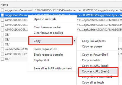 还是用懒人方法给大家演示,首先在“suggestions?.....”的请求上鼠标右键选择Copy→Copy as cURL。