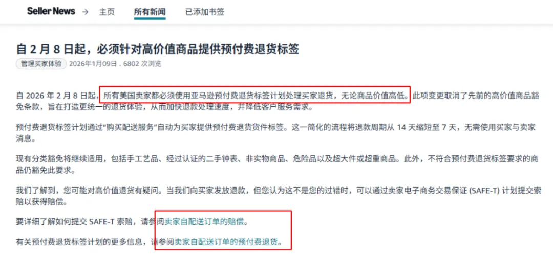 从2月8号开始,美国站所有自发货卖家,必须强制使用亚马逊预付退货标签(APRL)。以前那种 高价值商品豁免权 彻底取消了。
