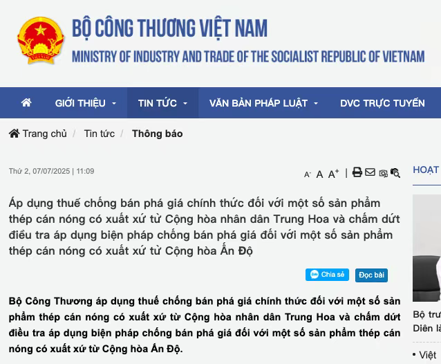 2025年7月7日,越南工贸部宣布正式对中国热轧钢卷征收23.1%至27.83%的反倾销税,自2025年7月6日起生效,有效期5年。