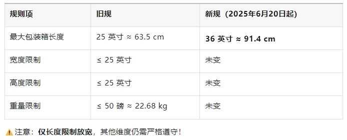 近日,亚马逊针对物流(FBA)中的外包装箱尺寸推出新规,自2025年6月20日起,美国站亚马逊物流订单的最大包装箱长度将从原来的25英寸放宽至36英寸。