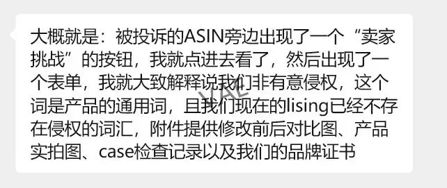 这位卖家因商标侵权收到投诉,首次申诉未通过后,原本已经打算放弃自行申诉,然后找服务商处理。后来她注意到后台新增了"卖家挑战”功能,抱着试一试的心态提交后,申诉竟然成功,直接省下了一笔申诉费用。