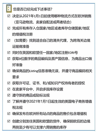 英国作为跨境电商出口欧洲的重要中转站,脱欧后意味着我们全球的跨境电商公司需要重新树立一个运营系统。另外,亚马逊官方也为欧洲站卖家列出了脱欧自查清单:
