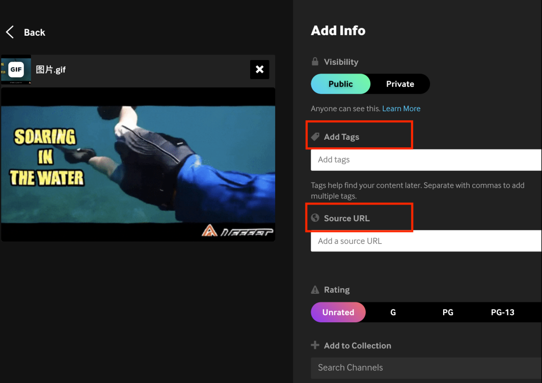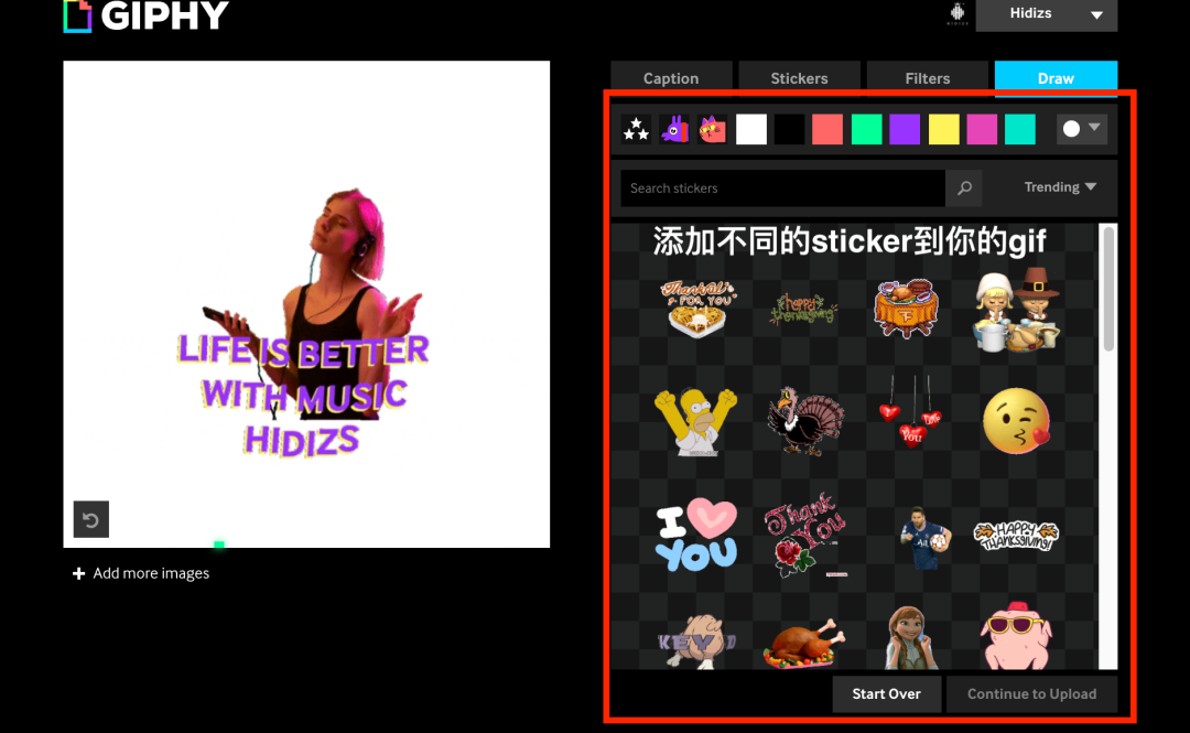 上传后页面如图。Giphy 提供了多种素材、滤镜、效果等工具,满足绝大部分 GIF/sticker 的制作需求。
