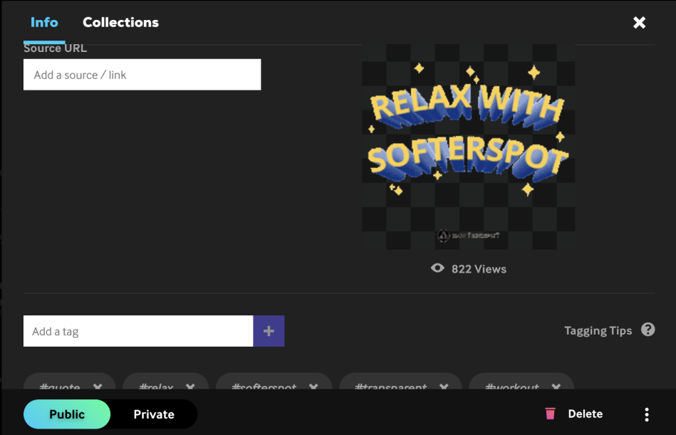 制作完成并上传完成后,可在个人主页查看上传贴纸,并且可以对链接、标签、公开/私人权限进行编辑,也可进行删除操作。