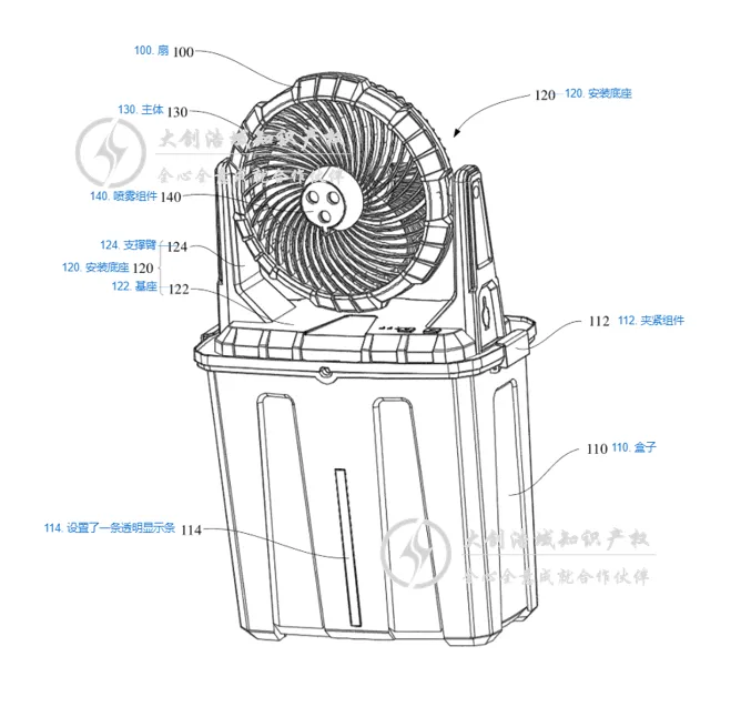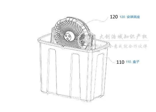 1. 盒体部分:必须包含盒体、安装底座和风扇主体,且风扇主体必须设置在安装底座上,两者的连接关系是固定的。