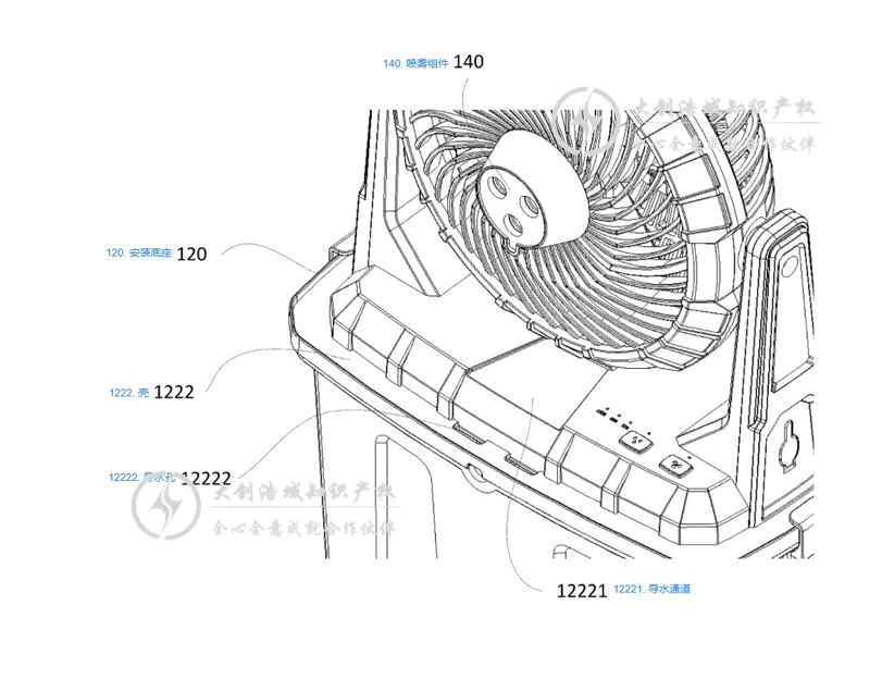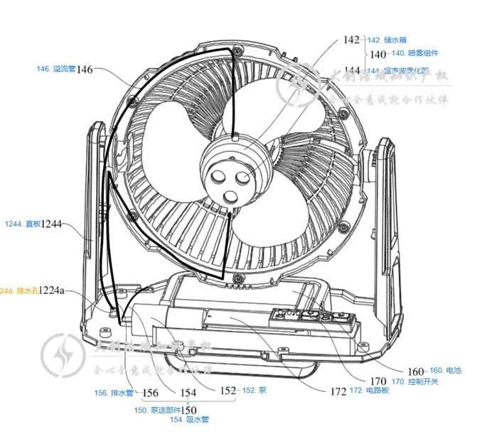 喷雾组件:位于风扇主体的出风口位置。它主要包括一个储水箱和至少一片超声波雾化片(利用超声波将水打成细雾)。 抽水组件:位于安装底座内部。核心是一个水泵,它通过吸水管从水源取水,再通过出水管将水输送至喷雾组件。