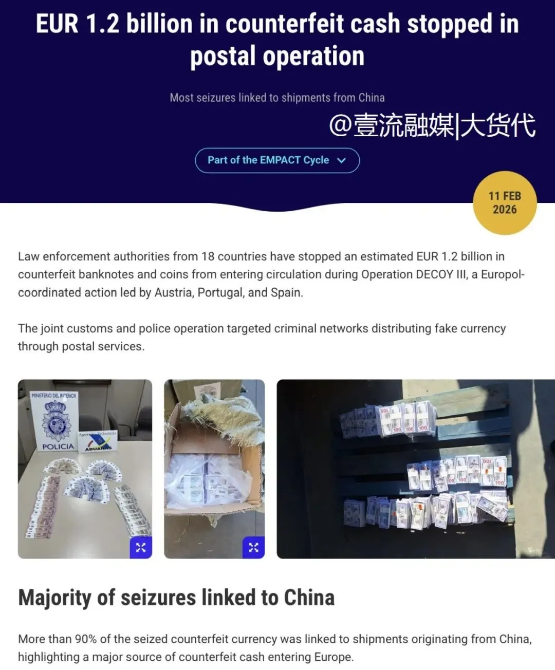 在行动中,他们阻止了约12亿欧元的假钞假币流入市场,并在调查中发现,大多数查获案件与中国有关——欧洲刑警组织:“查获的假币中超过 90% 与来自中国的货物有关,这凸显了流入欧洲的假币的一个主要来源。”