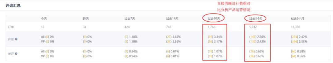 比如我对最近30天的订单量、评论总量和差评数(率)与最近3个月进行对比,对比发现差评率明显增长,我们查找在买家消息回复或者产品质量方面出现了问题,如果是订单量出现大幅度减少,可以去查找关键词或者广告方面是否需要优化。