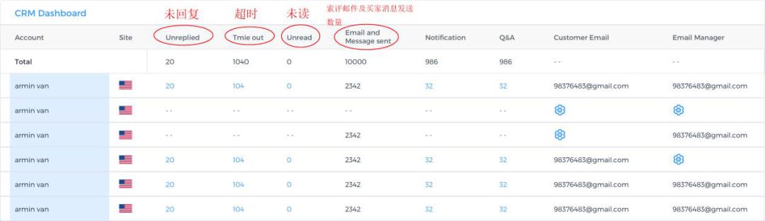 2、dashboard页面,集中监控所有邮件的回复情况,可以清晰掌控每天客服消息回复,了解每天回复数量、回复是否及时等问题,帮助卖家对客服消息回复进行优化。