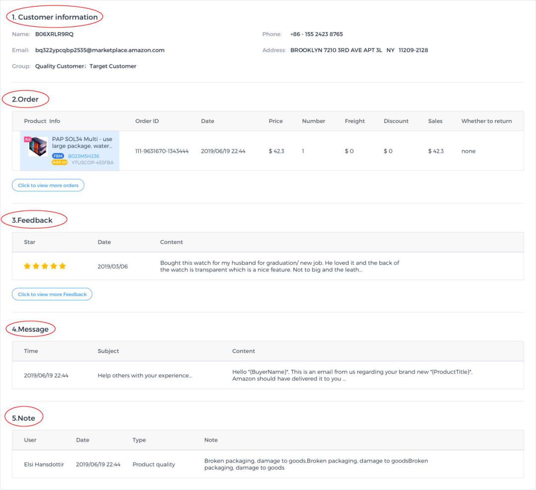 4KMILES的CRM系统,从买家回复消息开始,根据用户习惯,依次为卖家提供买家消息回复、买家标记分类、买家信息展示分析、买家信息过滤、邮件索评、再营销等功能,在邮件系统里,形成了对亚马逊邮件处理的完整闭环。
