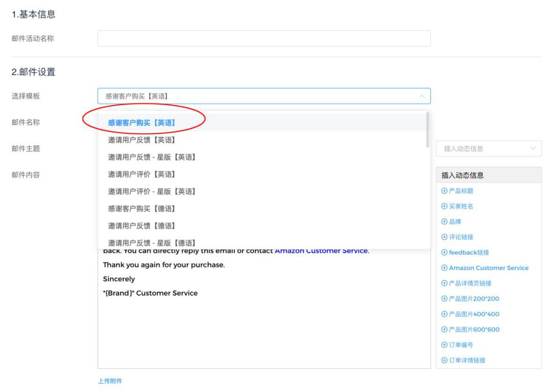 首先提前设置好索评模板,比如我要感谢客户的购买,在邮件设置中选择模板“感谢客户购买”,要注意的是根据不同的产品定制不同的邮件模板,比如针对服装和针对家具的,我们可以有两种不同关怀方式。