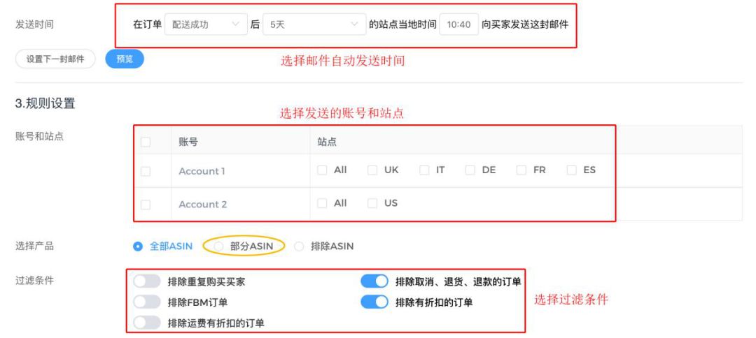 然后设置自动发送的时间和规则,比如设置在配送成功后立即向买家发送,多账号多站点卖家先设置发送的账号及站点,选择对应的ASIN。过滤掉不适合再发送索评邮件的人群,比如有取消订单、退货、退款行为的买家,还有重复购买、有折扣订单的买家,等等。