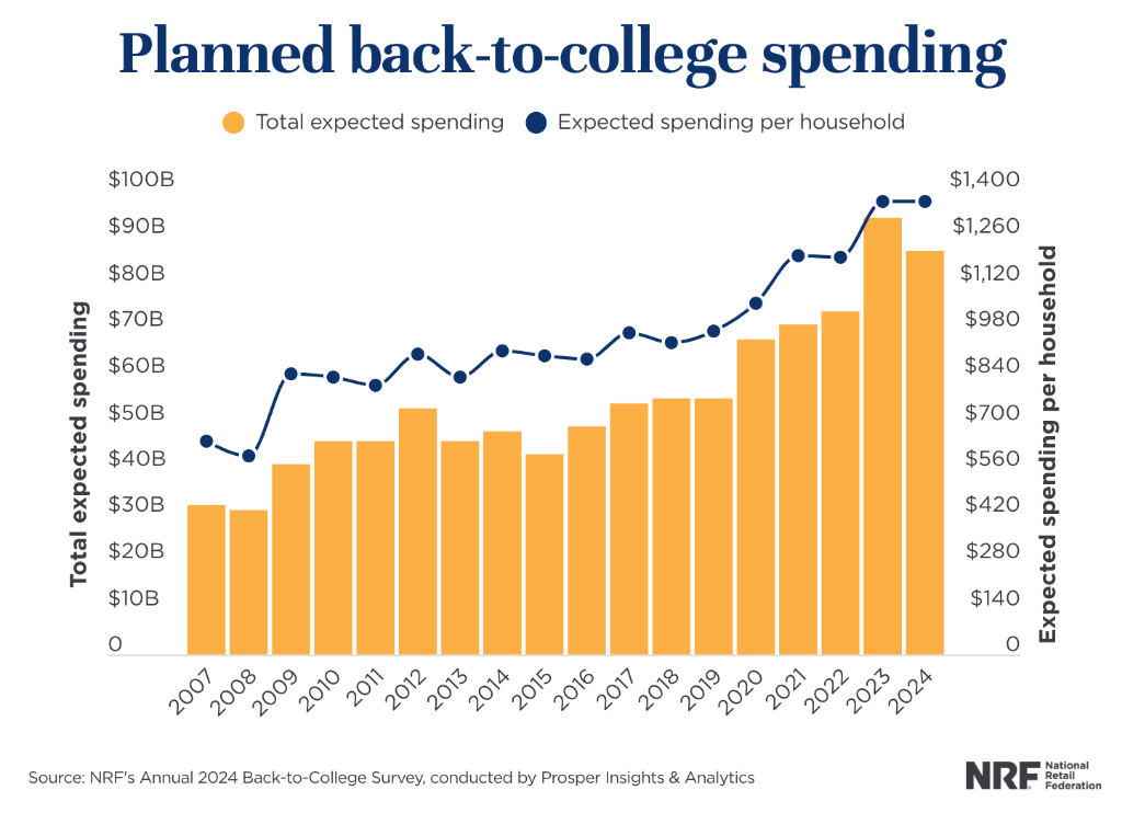 国家零售联合会(NRF)数据显示:2024 年返校季,K-12 家庭平均预算约为 875 美元,大学家庭预算约为 1,365 美元;总支出分别为 388 亿美元(K-12)和 870 亿美元(大学),总规模达到 1,258 亿美元,堪称“仅次于黑五”的年度消费高峰。