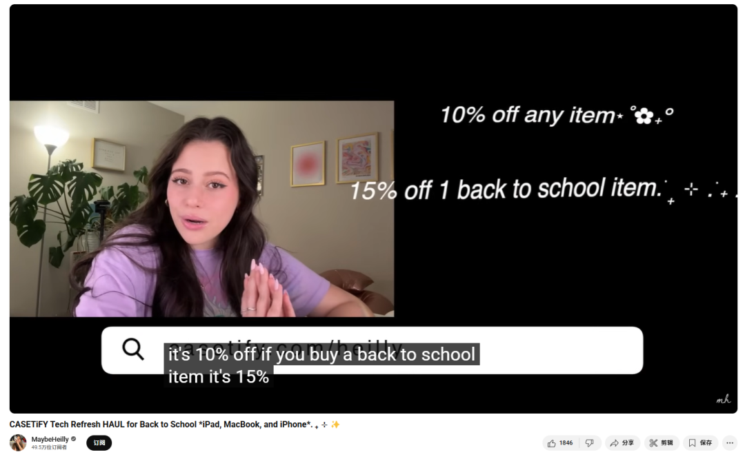 视频结尾,博主顺势介绍 Casetify 官网正在进行的返校季促销活动,并通过视频简介中的专属链接引导观众前往购买,实现内容与转化路径的顺畅衔接。上线三天内收获了超过 3.6 万次观看,在返校节点有效带动了品牌的曝光与购买转化。