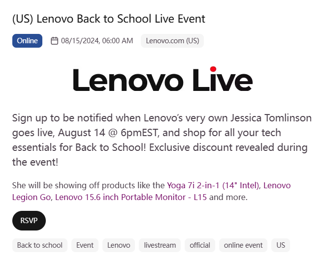 在 2024 年 8 月 14 日举行的 “Lenovo Back to School Live Event”(美国线上)中,联想邀请科技博主 Jessica Tomlinson 主持线上直播,介绍 Yoga 7i、Legion Go、便携显示器等返校季主推产品。直播过程中穿插产品展示、功能讲解、专属折扣码发布,并开放观众实时互动提问,增强了参与感与购买转化效率。