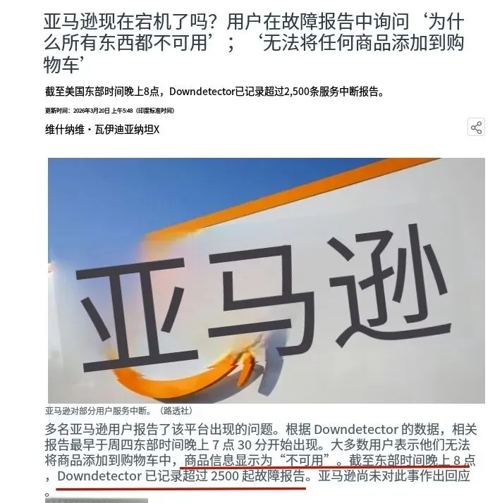 3月5日,亚马逊刚经历了一场“史诗级宕机”——北美订单量瞬间暴跌99%,超过630万笔订单“蒸发”,用户长达6小时无法结账、浏览商品。突发!亚马逊美国站崩了,中国卖家损失惨重