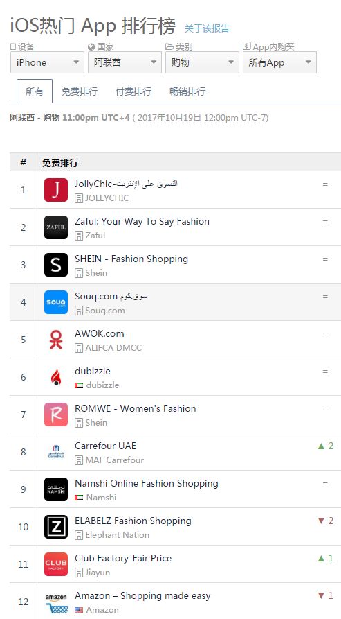 根据App Annie的数据,截至2017年10月19日,阿联酋iOS购物类热门App排行榜中,前五的依次为:JollyChic、Zaful、SHEIN、Souq和AWOK.com。其中,JollyChic和SHEIN均为中国企业,而亚马逊则排名到12名。