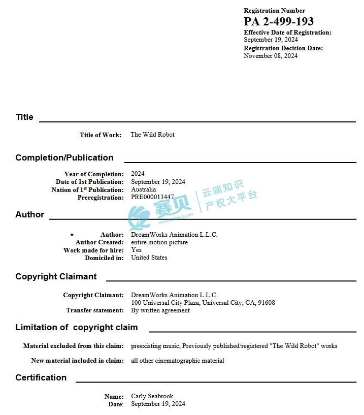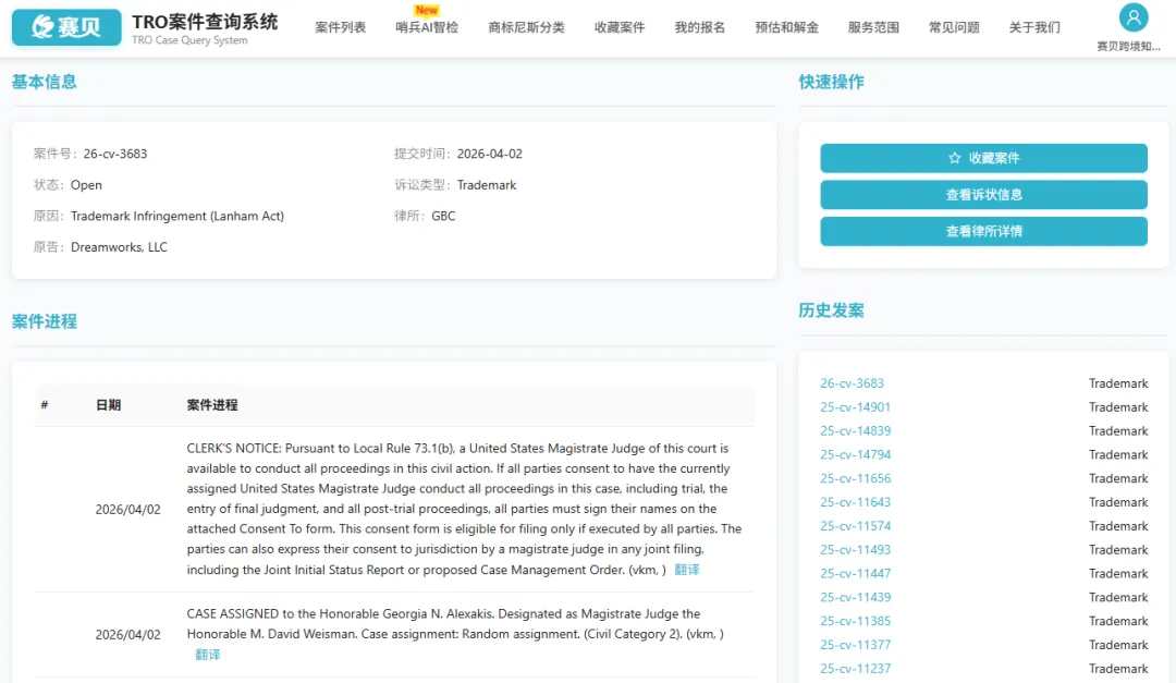 【26-cv-3683】梦工厂维权:荒野机器人 The Wild Robot 商标 + 版权双维权!玩具 / 服饰 / 文创类产品紧急下架