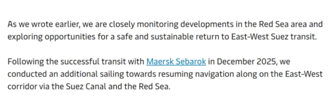 此前,在2025年12月18日至19日,“Maersk Sebarok”轮已率先完成通航,成为马士基近两年来首艘重返红海航道的集装箱船。