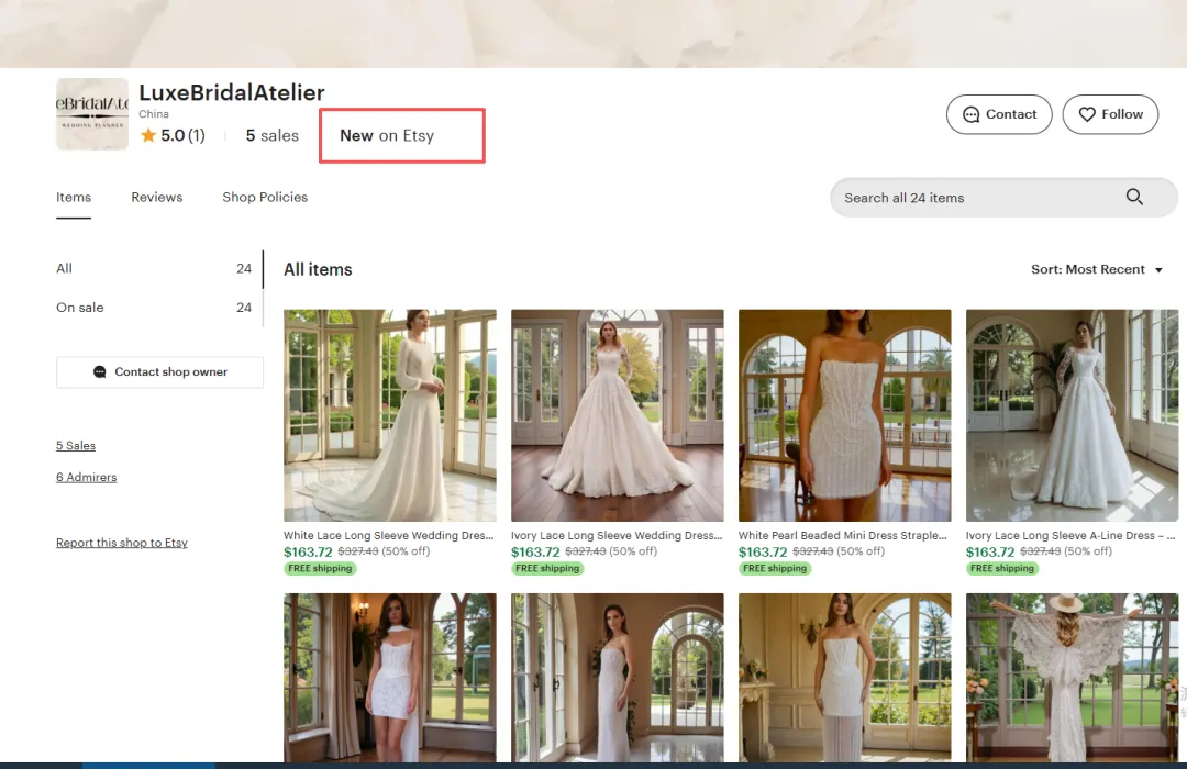 比如下面这家卖婚纱的店铺,可以看到"New on Etsy" 是刚入驻不久,已经出5单了,这出单率没得说,几天的功夫八百多美元就到手了,这钱也太好赚了。