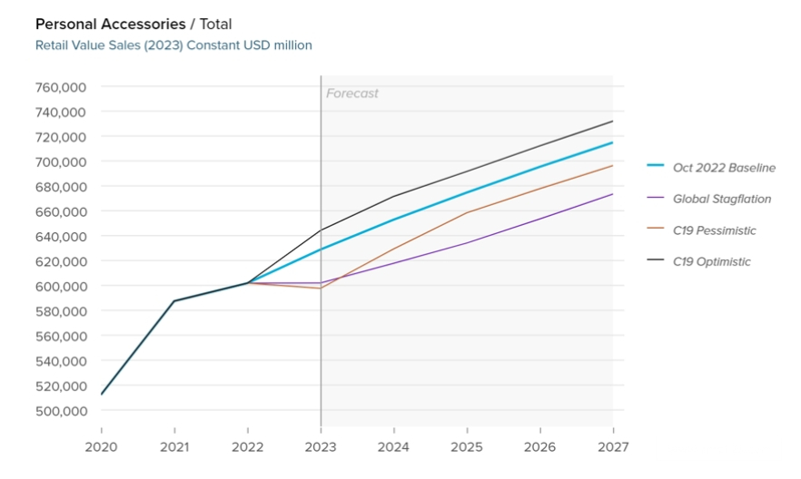 根据Euromonitor International的最新数据,今年全球配饰市场的增长步伐有所放缓。在地缘政治风险增加、利率上升、全球通胀、经济动荡和供应链中断等多重危机下,市场消费走弱,需求持续抑制。