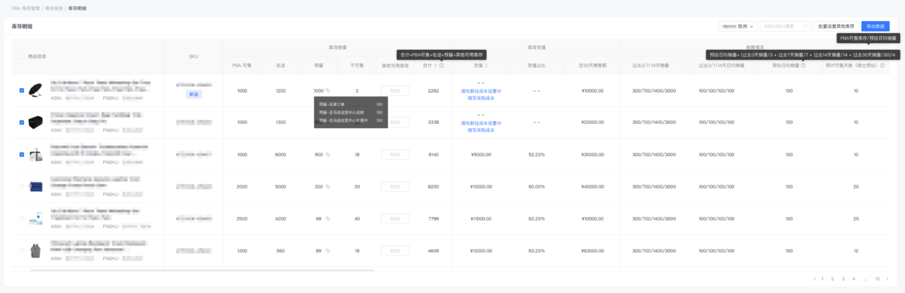 以这个目标为原理,记录你的库存明细以及店铺以往销售数据,然后依据记录数据,分别计算每个 SKU 的预估日均销量和预计可售天数。