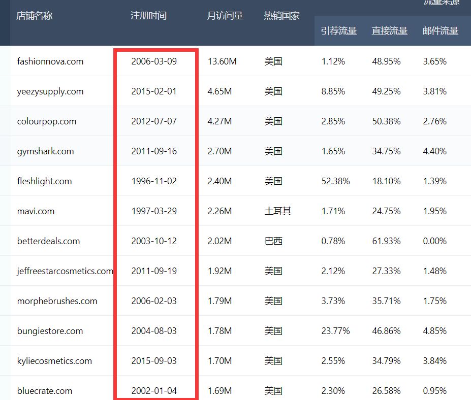 2.注册时间,我们看一下这些顶级的独立站,哪一个不是好多年的沉淀,最早的96年的最晚的15年的也是厉害了,所以我在前面所述,要想做长远的生意,独立站是必然之路!