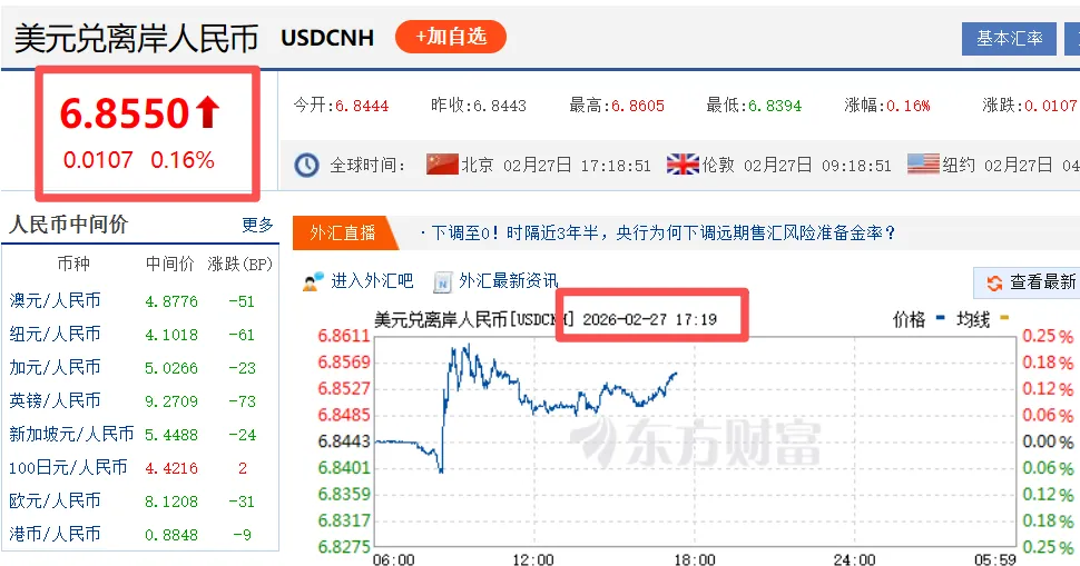 截止发稿,离岸人民币兑美元略回调为6.85。