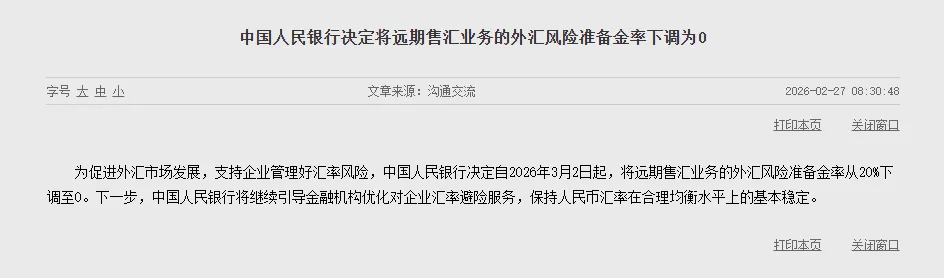 2月27日央行发布公告,自3月2日起,将远期售汇业务的外汇风险准备金率从20%下降至0,就是呵护市场流动性的明确信号。