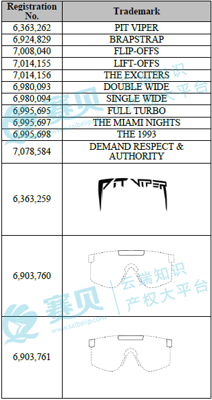 案件涉及Pit Viper 的12项美国注册商标,覆盖9大类产品/服务,眼镜+服装是重点,赛贝提醒跨境卖家,未经授权不得擅自使用,以免引发侵权风险。