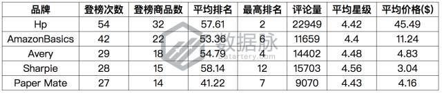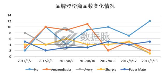 可以看到,在上周的Best Sellers榜单中,品牌Hp再次凭借每日登榜商品数6款以上完美发挥统治榜单;马克笔相关产品品牌Expo紧随其后,在2017年8月7日、8月8日、8月10日三天 中单日上榜商品数突破8款,以总等榜次数50次的成绩位列品牌综合排名第二;此外,亚马逊自营品牌AmazonBasics、文具品牌Paper Mate以及胶水系列产品品牌Elmer's分别位列品牌综合排名第三、四、五位。