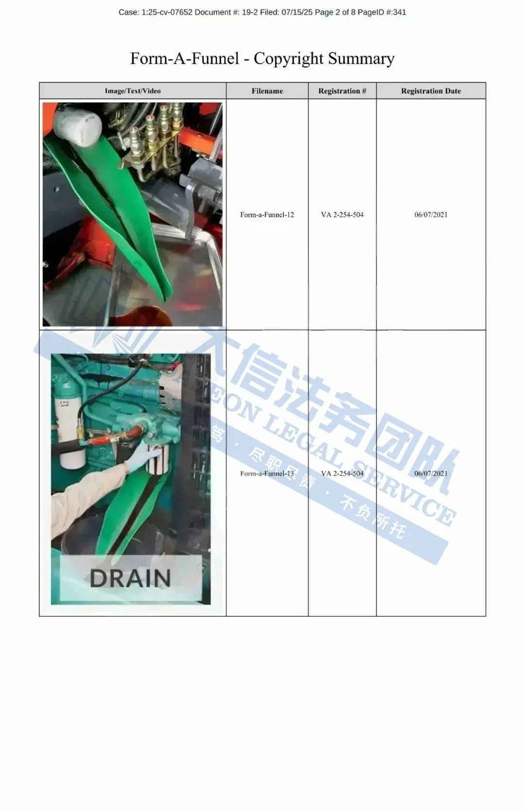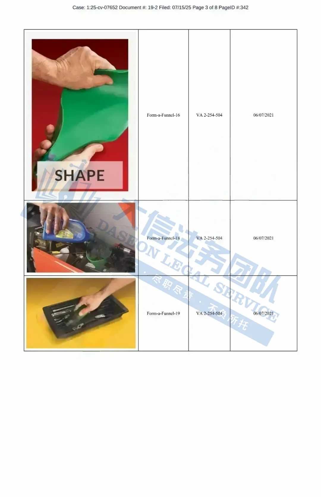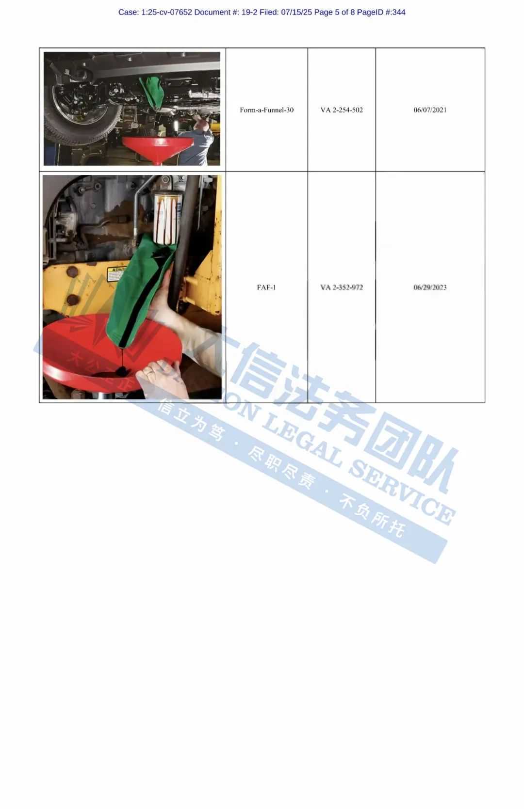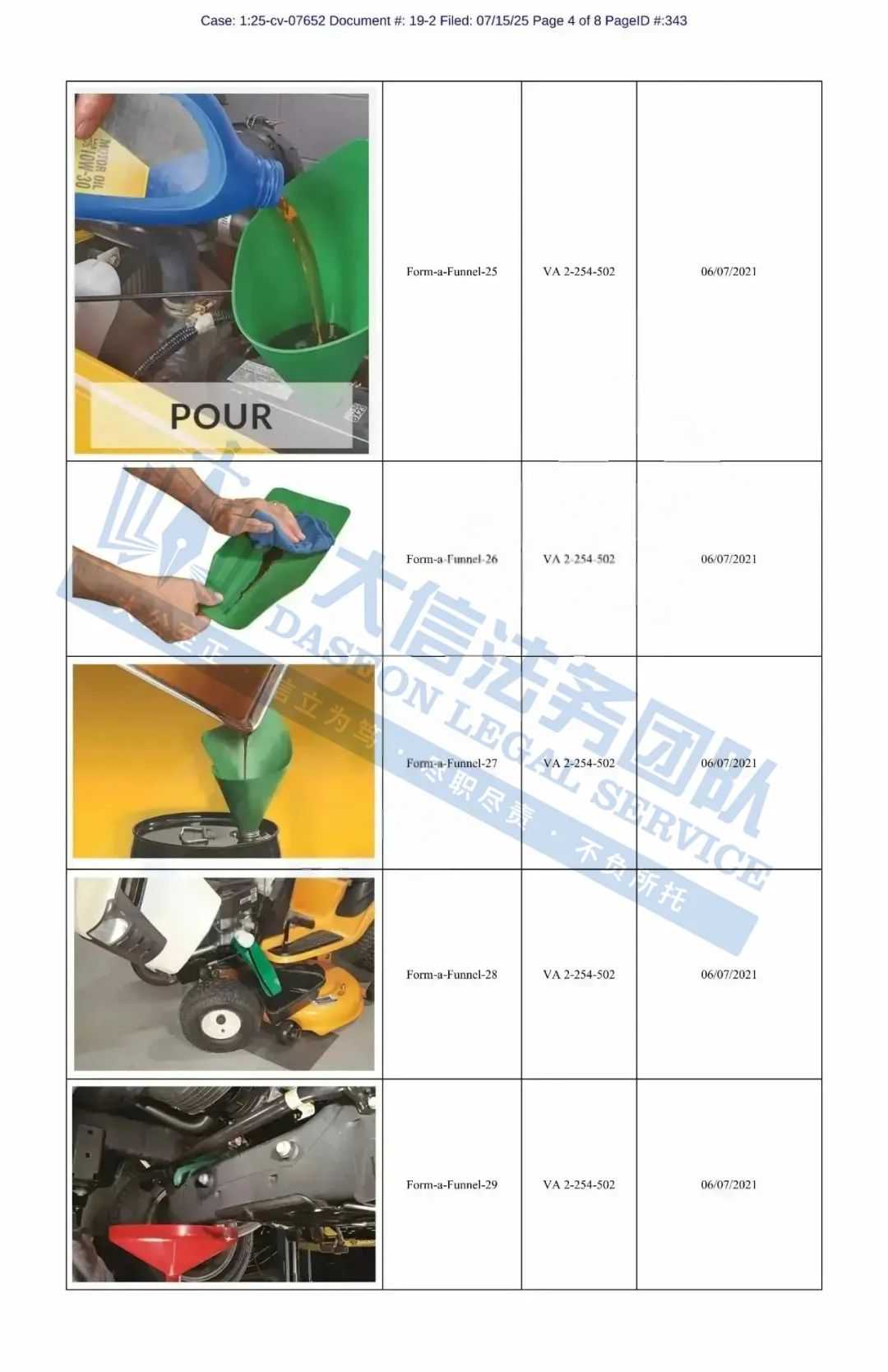 原告是一家源自美国德克萨斯州的实用工具制造商,旗下有一款核心品牌Form-A-Funnel是一款柔性排油工具,用于将油从小型到大型车辆、摩托车、飞机和重型设备引导到排油管中,以便轻松、无障碍地更换油。它可以轻松塑造形状,将难以排出的液体直接排入排水管,从而防止油和其他液体接触到用户、车辆和车间地板,适用各种难以到达的空间,能够轻松排出割草机的油,避免油液四处飞溅。