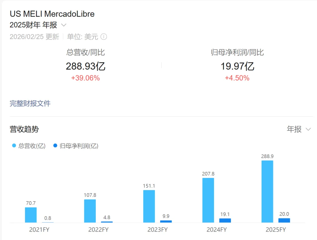 近日,拉美电商巨头美客多(Mercado Libre)公布2025年第四季度财报,净收入和财务收入为87.59亿美元,同比增长45%,按中性货币计算增长47%;营业利润为8.89亿美元,营业利润率为10.1%;净利润为5.59亿美元,利润率为6.4%;每股收益(EPS)为11.03 美元(根据流通股计算的近似值)。