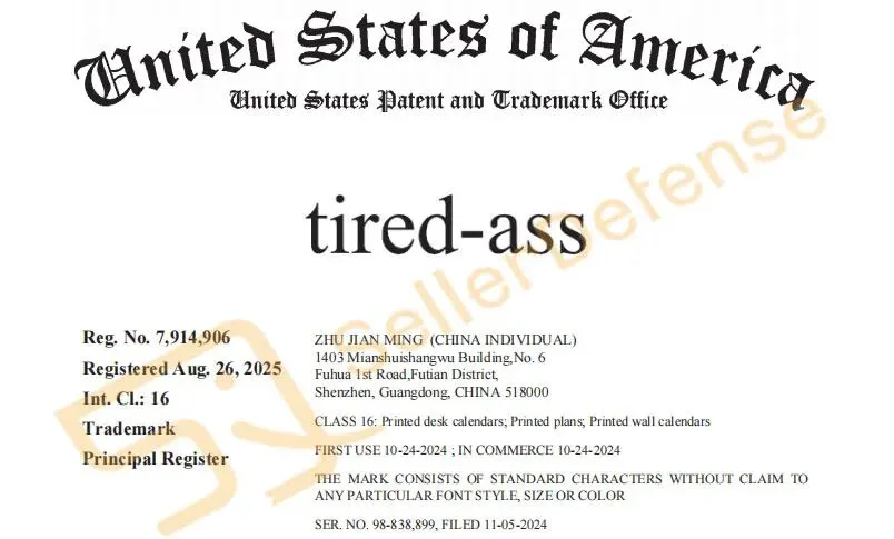 本案为国人原告,案件涉及商标注册在第16类办公用品类。Tired-Ass 是一个美国俚语,带有强烈的感情色彩,意思是疲惫厌烦的。请相关卖家注意排查下架!