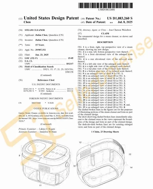 本案为国人原告,案件涉及外观专利产品是一款便携式蒸汽清洁器,通过高温蒸汽可有效清洁顽固油污和污渍。