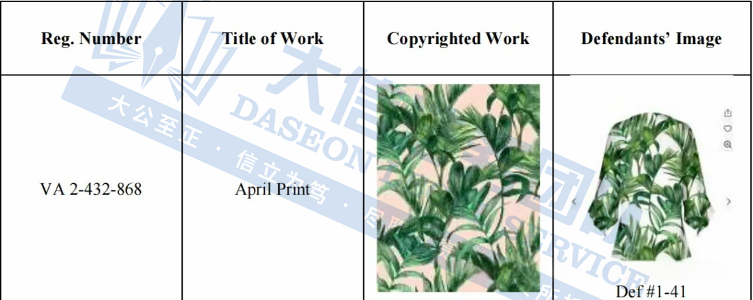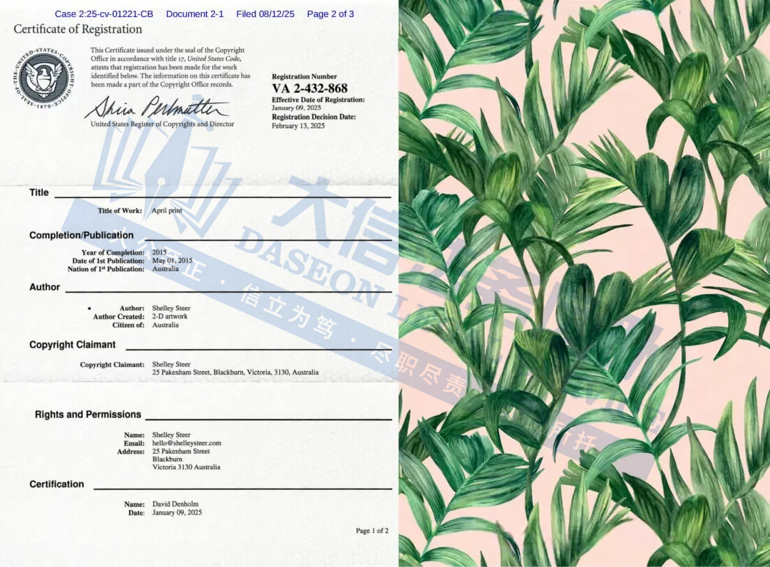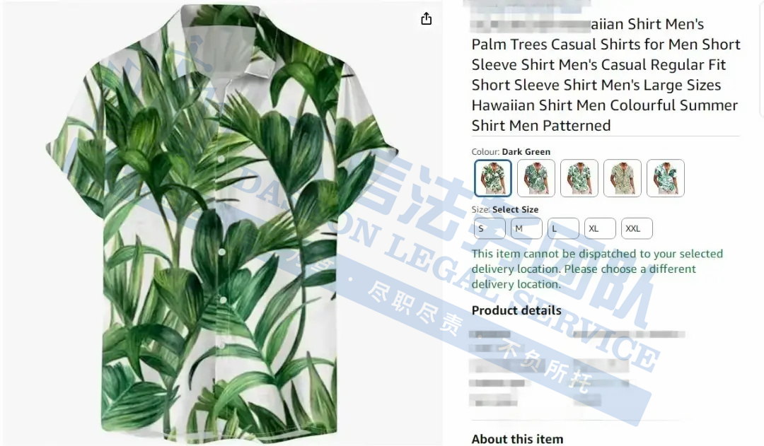此案为版权维权,涉及一幅绿色棕榈树叶植物版权作品,目前已有41名卖家店铺被冻。版权号为:VA 2-432-868,以下是涉及版权具体信息,未经授权不得擅自使用,侵权风险极高,跨境卖家尤其是服装卖家尽快检索下架,避免TRO侵权风险!