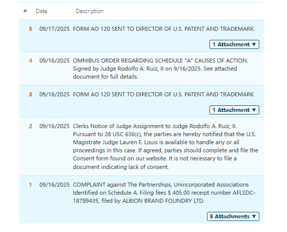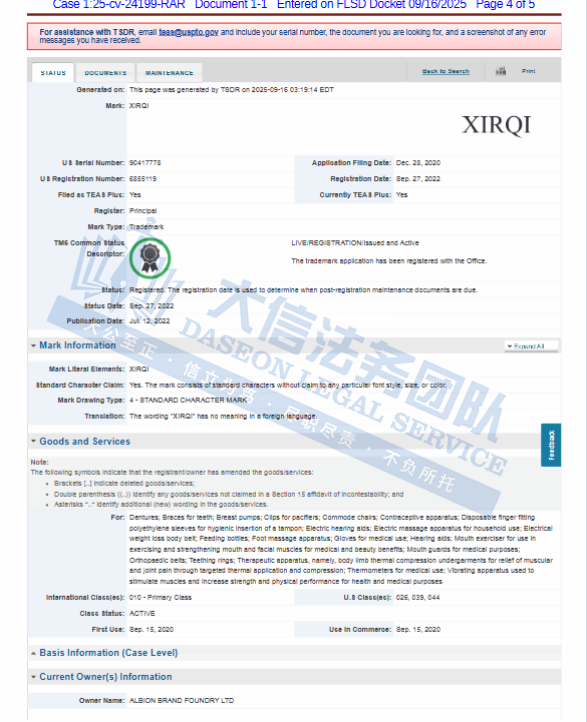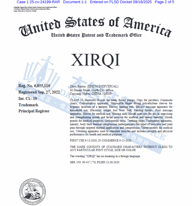 此案为商标维权,涉及XIRQI商标,注册类别是第10类,全是医疗用品类,值得注意的是,原告在今年7月份就曾针对BESTSKY商标在佛罗里达州发起(案件号25-cv-23395),并成功冻结127家店铺,以下是涉及商标具体信息,未经授权不得擅自使用,侵权风险极高,跨境卖家尤其是服装卖家尽快检索下架,避免TRO侵权风险!