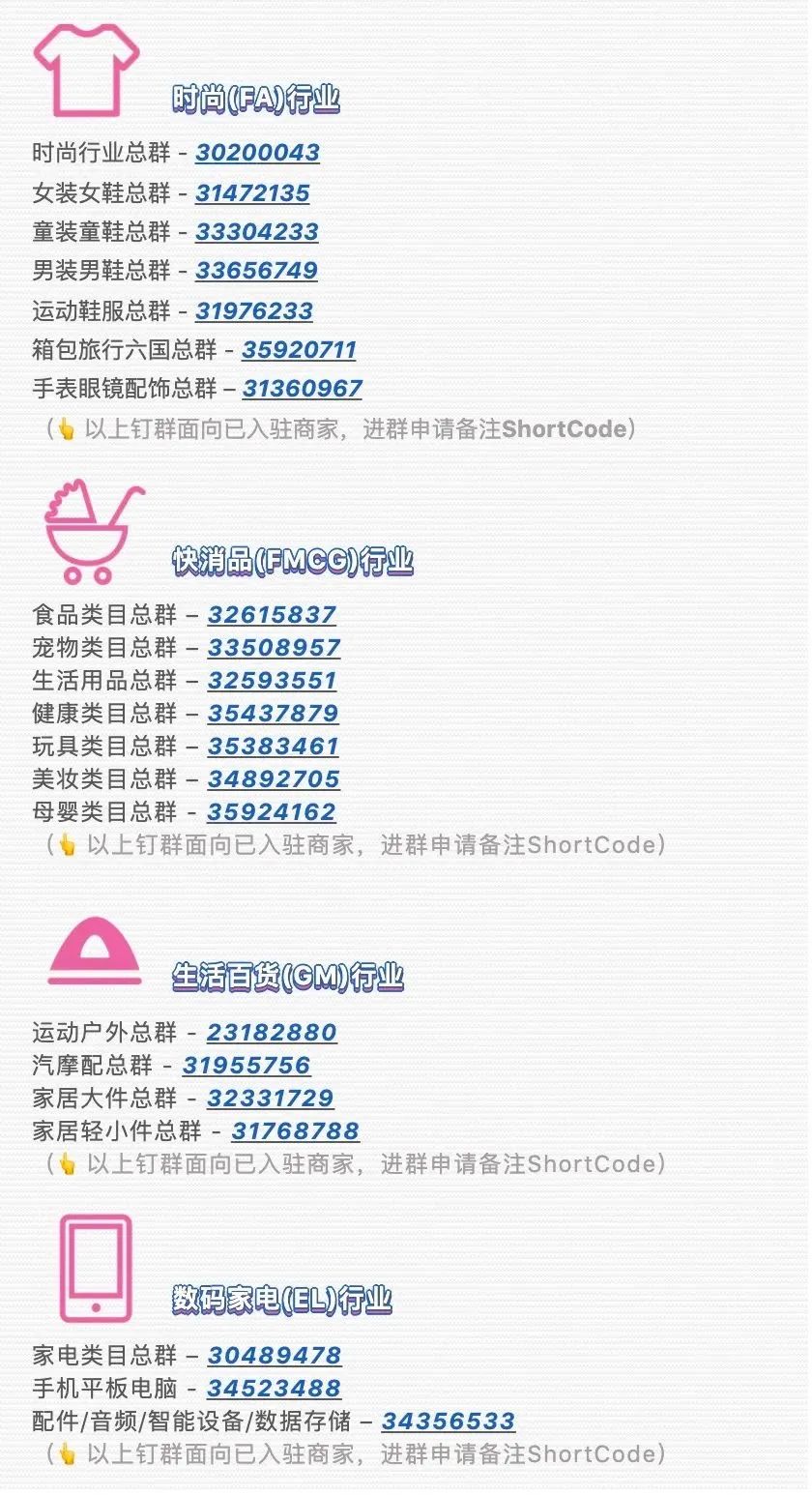 可点击公众号下方菜单栏右下角【官方入口-行业钉群】即可获取行业群号,进群要备注shortcode(店铺号)。