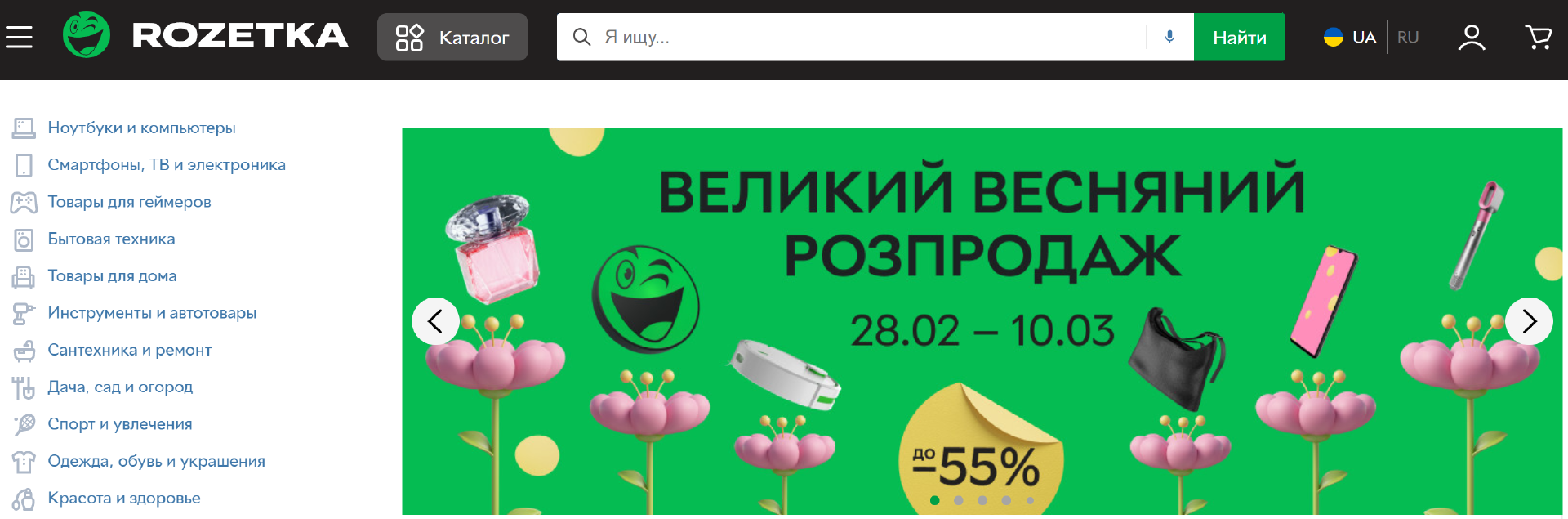 Rozetka.com.ua是乌克兰最知名的电商平台之一,提供广泛的商品选择,包括电子设备、家居用品、服装等。该平台以用户友好的界面和高质量的消费者服务而闻名。