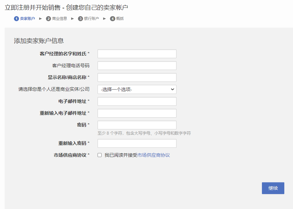 (1)注册账户:填写包括个人信息、商店信息、银行账户信息在内的详细内容;